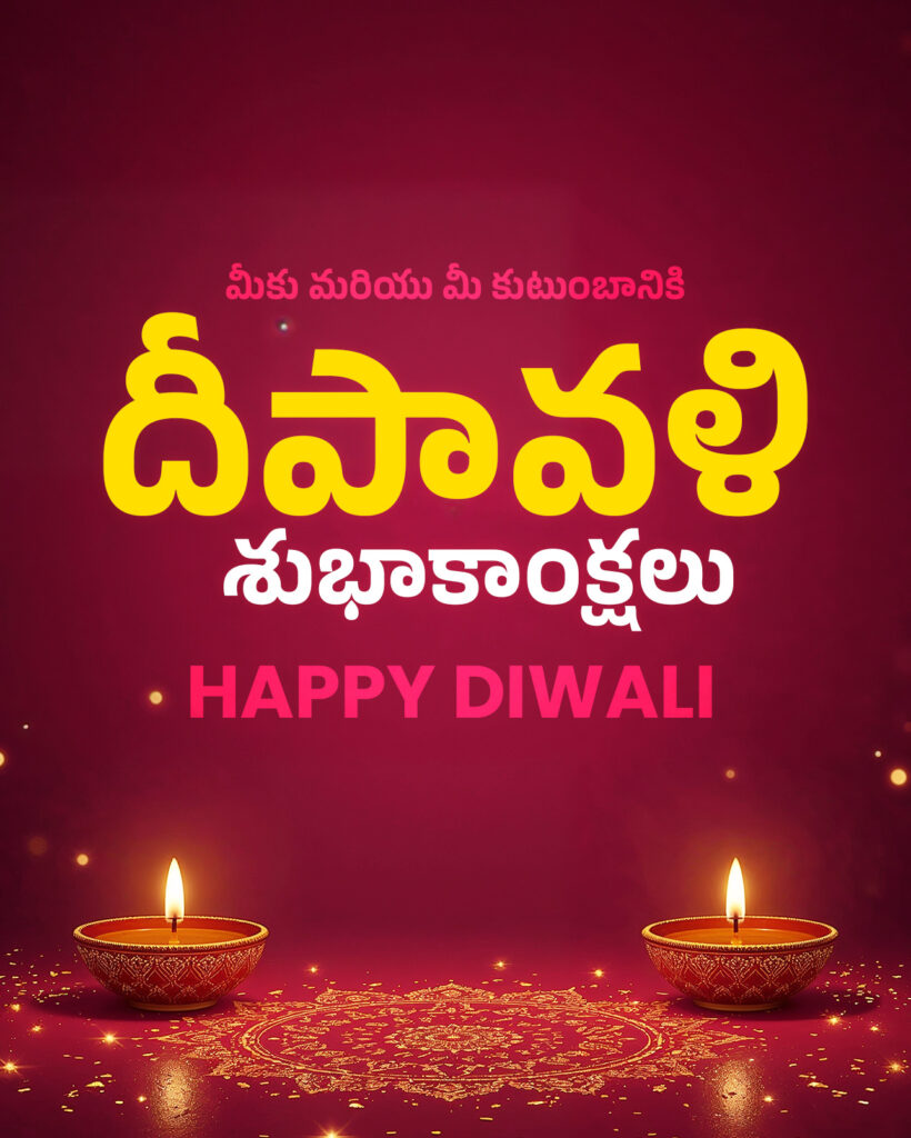 Featuring two beautiful diyas on a deep maroon backdrop and the Telugu wish “మీకు మరియు మీ కుటుంబానికి దీపావళి శుభాకాంక్షలు”, this design is a perfect festive message of love and prosperity.